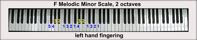 Here are the F Minor Scales: the natural minor scale, the melodic minor scale, and the harmonic minor scale. Fingerings are included.