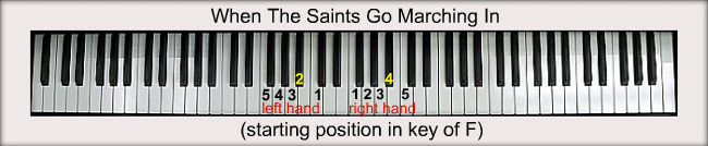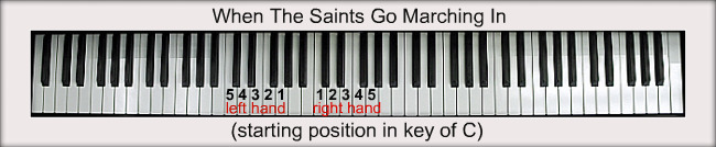 "When The Saints Go Marching In" is another simple tune which makes a good note-learning exercise on the piano, also helping you develop your familiarity with the finger numbers. Learn and memorize it in C, F, and G, hands separately and hands together.